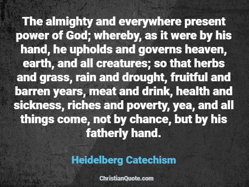 The almighty and everywhere present power of God; whereby, as it were by his hand, he upholds and governs heaven, earth, and all creatures; so that herbs and grass, rain and drought, fruitful and barren years, meat and drink, health and sickness, riches and poverty, yea, and all things come, not by chance, but by his fatherly hand.