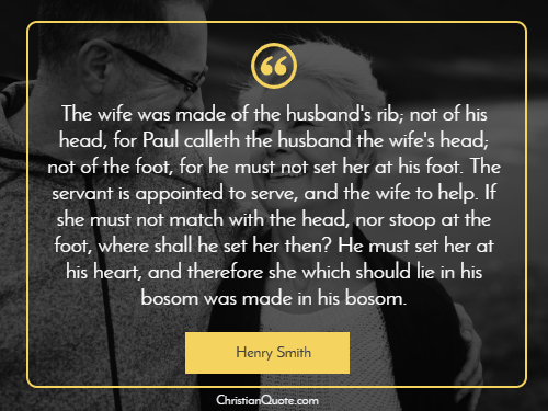 The wife was made of the husband’s rib; not of his head, for Paul calleth the husband the wife’s head; not of the foot, for he must not set her at his foot. The servant is appointed to serve, and the wife to help. If she must not match with the head, nor stoop at the foot, where shall he set her then? He must set her at his heart, and therefore she which should lie in his bosom was made in his bosom.