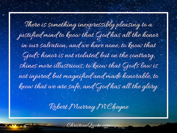 There is something inexpressibly pleasing to a justified mind to know that God has all the honor in our salvation, and we have none; to know that God’s honor is not violated, but on the contrary, shines more illustrious; to know that God’s law is not injured, but magnified and made honorable, to know that we are safe, and God has all the glory.