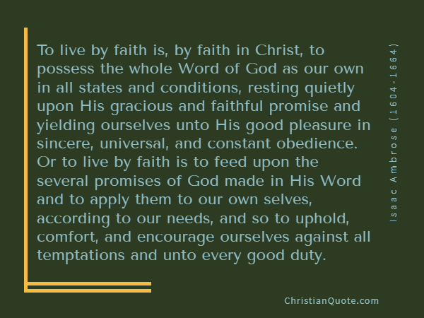 To live by faith is, by faith in Christ, to possess the whole Word of God as our own in all states and conditions, resting quietly upon His gracious and faithful promise and yielding ourselves unto His good pleasure in sincere, universal, and constant obedience. Or to live by faith is to feed upon the several promises of God made in His Word and to apply them to our own selves, according to our needs, and so to uphold, comfort, and encourage ourselves against all temptations and unto every good duty.