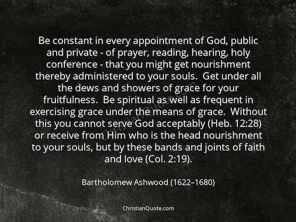 Be constant in every appointment of God, public and private – of prayer, reading, hearing, holy conference – that you might get nourishment thereby administered to your souls. Get under all the dews and showers of grace for your fruitfulness. Be spiritual as well as frequent in exercising grace under the means of grace. Without this you cannot serve God acceptably (Heb. 12:28) or receive from Him who is the head nourishment to your souls, but by these bands and joints of faith and love (Col. 2:19).