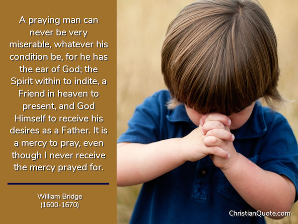 A praying man can never be very miserable, whatever his condition be, for he has the ear of God; the Spirit within to indite, a Friend in heaven to present, and God Himself to receive his desires as a Father. It is a mercy to pray, even though I never receive the mercy prayed for.