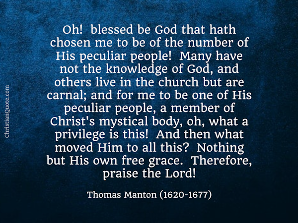 Oh! blessed be God that hath chosen me to be of the number of His peculiar people! Many have not the knowledge of God, and others live in the church but are carnal; and for me to be one of His peculiar people, a member of Christ’s mystical body, oh, what a privilege is this! And then what moved Him to all this? Nothing but His own free grace. Therefore, praise the Lord!