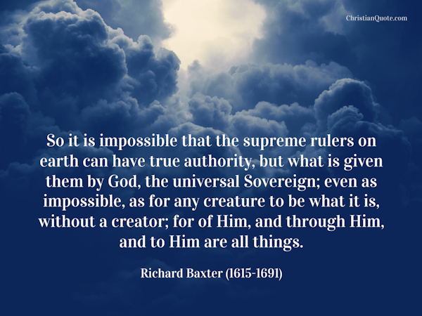 So it is impossible that the supreme rulers on earth can have true authority, but what is given them by God, the universal Sovereign; even as impossible, as for any creature to be what it is, without a creator; for of Him, and through Him, and to Him are all things.