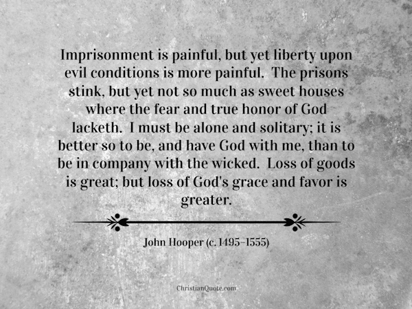 Imprisonment is painful, but yet liberty upon evil conditions is more painful. The prisons stink, but yet not so much as sweet houses where the fear and true honor of God lacketh. I must be alone and solitary; it is better so to be, and have God with me, than to be in company with the wicked. Loss of goods is great; but loss of God’s grace and favor is greater.
