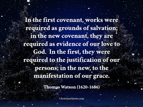 In the first covenant, works were required as grounds of salvation; in the new covenant, they are required as evidence of our love to God. In the first, they were required to the justification of our persons; in the new, to the manifestation of our grace.