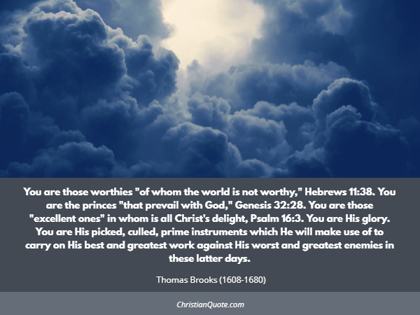 You are those worthies “of whom the world is not worthy,” Hebrews 11:38. You are the princes “that prevail with God,” Genesis 32:28. You are those “excellent ones” in whom is all Christ’s delight, Psalm 16:3. You are His glory. You are His picked, culled, prime instruments which He will make use of to carry on His best and greatest work against His worst and greatest enemies in these latter days.