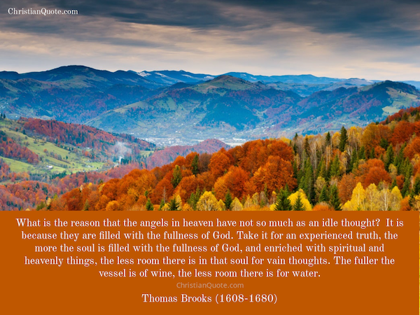 What is the reason that the angels in heaven have not so much as an idle thought? It is because they are filled with the fullness of God. Take it for an experienced truth, the more the soul is filled with the fullness of God, and enriched with spiritual and heavenly things, the less room there is in that soul for vain thoughts. The fuller the vessel is of wine, the less room there is for water.