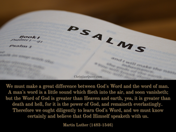 We must make a great difference between God’s Word and the word of man. A man’s word is a little sound which flieth into the air, and soon vanisheth; but the Word of God is greater than Heaven and earth, yea, it is greater than death and hell, for it is the power of God, and remaineth everlastingly. Therefore we ought diligently to learn God’s Word, and we must know certainly and believe that God Himself speaketh with us.